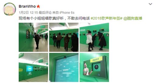 酷狗直播主打的“歌手多”,其實(shí)真不是夸大,在酷狗直播平臺上至少有35萬個(gè)歌手主播。“地鐵歌聲新年簽”活動借著節(jié)日的美好寓意,于2018年的第一天正式上線,路過的乘客與神奇的2018歌聲新年簽互動裝置產(chǎn)生了奇妙的化學(xué)反應(yīng),不僅很好的暗合了酷狗直播的品牌主張:歌手多(每個(gè)人都可以是歌手),還給北京和廣州兩個(gè)地方的乘客帶來了很好的觀賞與互動體驗(yàn):畢竟在每天那么多無聊辣眼睛廣告的熏陶下,期待值已經(jīng)降低了很多,突然來這么一個(gè)又可以互動又養(yǎng)眼的廣告,頓時(shí)產(chǎn)生了大量的“自來水”。