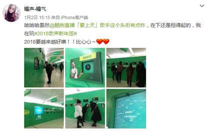 你站在屏幕前拿著麥克風(fēng)對準(zhǔn)屏幕唱一首歌,屏幕將測算出你是哪種“歌手”,燈帶會引導(dǎo)你走向特定的「歌手新年簽」喇叭,并播放該類型歌手的對應(yīng)歌曲,系統(tǒng)還會打印出紙質(zhì)版新年簽,上面附有對應(yīng)歌詞、2018全年趣味運(yùn)勢等,很多網(wǎng)友把這些有趣的內(nèi)容也分享到了微博上。