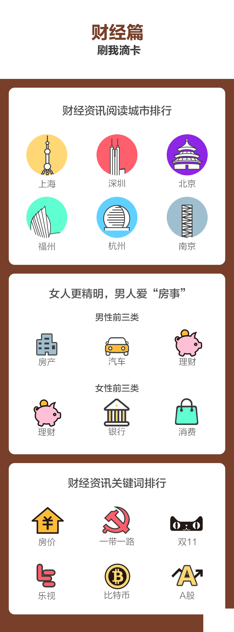 在財經(jīng)頻道用戶中,上海的“金融中心”地位名副其實,拿下財經(jīng)類資訊閱讀量第一城市;而在財經(jīng)資訊細分類型中,女性最關(guān)注的是理財,而男性最關(guān)注的是房產(chǎn)。在財經(jīng)類關(guān)鍵詞中,房價、比特幣、A股熱詞等都悉數(shù)上榜。