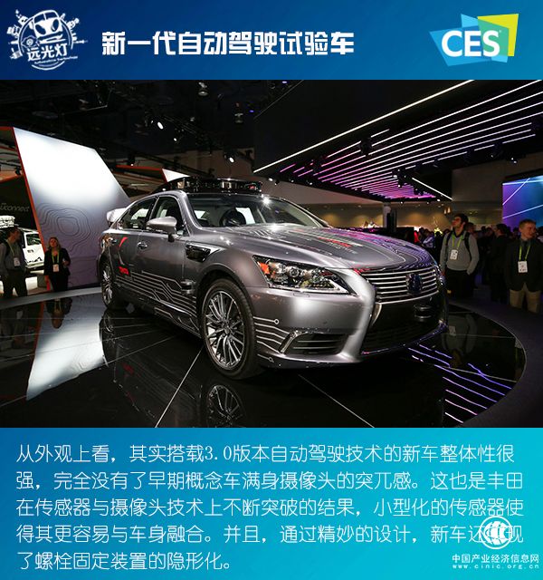 在本屆CES上,豐田汽車展示了基于“Platform3.0”打造的新一代自動(dòng)駕駛試驗(yàn)車。該自動(dòng)駕駛試驗(yàn)車以老款Lexus LS 600hL為原型,通過對(duì)自動(dòng)駕駛技術(shù)的革新,第三代自動(dòng)駕駛試驗(yàn)車所搭載的傳感器集成度更高,車輛的整體性進(jìn)一步增強(qiáng),這也使得新車設(shè)計(jì)愈發(fā)接近量產(chǎn)車型。