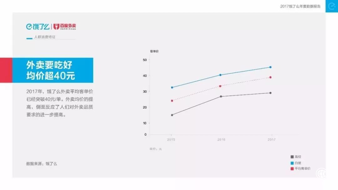 而且消費的客單價也有明顯的提升,消費主力從低客單價高校學(xué)生群體(23元)轉(zhuǎn)化為高客單價白領(lǐng)群體(43元),餓了么平臺數(shù)據(jù)顯示,目前平均客單價已突破40元。其中,點個牛肉面順帶一盒現(xiàn)切水果已是家常便飯,人群比例達到38%。而且非正餐時間的外賣購買頻次也在上升,消費者有了早餐、下午茶、夜宵等更多場景下的需求,高頻打低頻的商業(yè)邏輯正在被驗證。