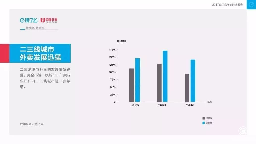 美團因其團購業(yè)務(wù),在非一線城市一度風(fēng)生水起。餓了么也看到渠道下沉的潛力,正在布局加強業(yè)務(wù)覆蓋,培養(yǎng)三四線城市用戶外賣消費習(xí)慣。截止到2017年12月底,餓了么覆蓋的城市數(shù)量超過2000+,在我國絕大部分的縣級城市全面鋪開。