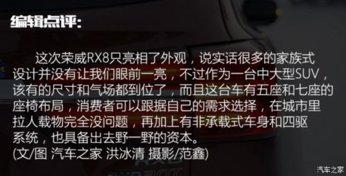 新春將近,在我們正在熱熱鬧鬧準(zhǔn)備年貨的時候,榮威也給我們準(zhǔn)備了一件“禮物”,榮威RX8。這款在冰雪挑戰(zhàn)賽有出色表現(xiàn)的豪華SUV,有著非承載車身+TOD四驅(qū)系統(tǒng)的七座中大型SUV,只不過這次我們只能先車外看看它,先來一睹它的容貌吧。