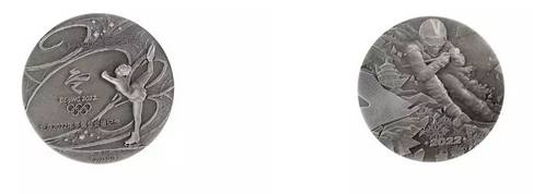該銀章正面為花樣滑冰運(yùn)動(dòng)員在冰面上滑行的痕跡所構(gòu)成的“2022”字樣,優(yōu)雅唯美。背面為自由滑雪運(yùn)動(dòng)員高速滑行的瞬間,飛揚(yáng)的起的白雪,展現(xiàn)出冬奧會(huì)的力與美。