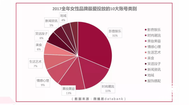 女性類品牌在投放中,也呈現(xiàn)出了比較明顯的女性特色,對于垂直類賬號投放更高。微播易數(shù)據(jù)顯示,2017年全年,影音娛樂、時(shí)尚潮流、美容美妝類自媒體賬號最受女性品牌喜歡,占比總投放的55%。