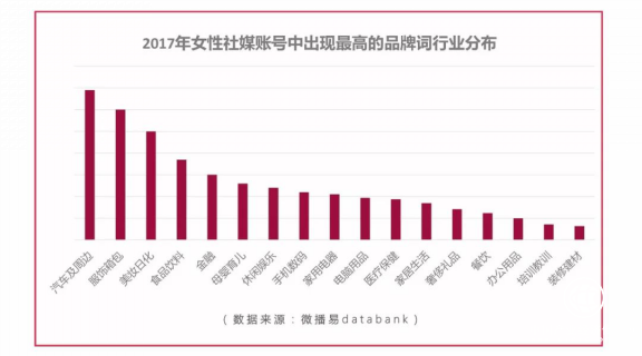 此外,微播易還對2017年女性社媒賬號中出現(xiàn)最高的品牌詞行業(yè)分布情況進(jìn)行了分析,發(fā)現(xiàn):