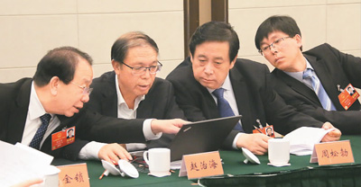3月9日,全國(guó)兩會(huì)河北代表團(tuán)舉行小組會(huì)議,審查計(jì)劃報(bào)告和預(yù)算報(bào)告。圖為代表們?cè)跁?huì)上交流,談?wù)搱?bào)告中的相關(guān)數(shù)據(jù)。本報(bào)記者史自強(qiáng)攝