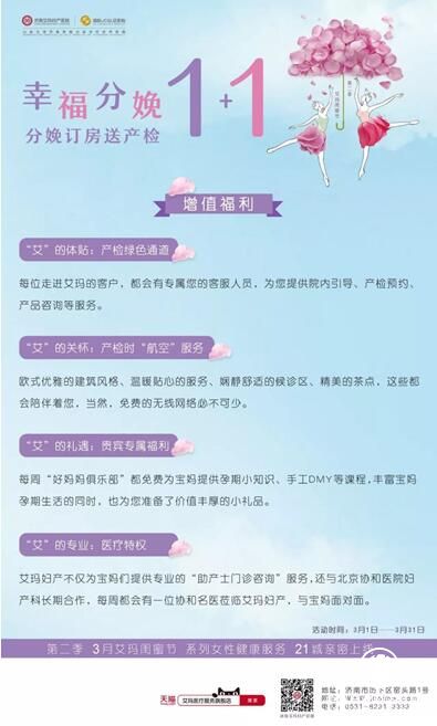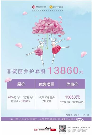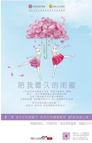 你好,歲月!你好,我的閨蜜!3月,濟南艾瑪婦產(chǎn)醫(yī)院第二季“艾瑪閨蜜節(jié)”系列女性健康服務泉城親密上線,女性健康體檢/備孕檢查/全面產(chǎn)檢/舒適分娩/菲蜜麗私密維養(yǎng),滿滿優(yōu)惠暖心來臨。