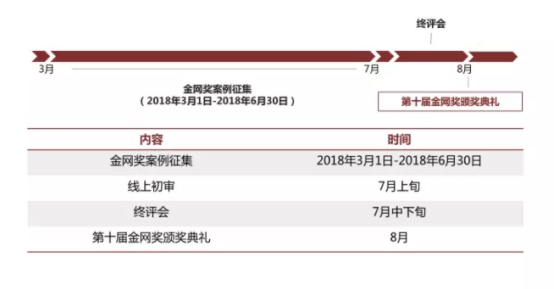 本屆金網(wǎng)獎(jiǎng)案例征賽已于3月1日開放,6月30日截止,7月份緊張的線上初審及線下終評(píng)過后,于8月迎來2018數(shù)字商業(yè)峰會(huì)暨第十屆金網(wǎng)獎(jiǎng)?lì)C獎(jiǎng)典禮,所有獲獎(jiǎng)作品及企業(yè)、人物、產(chǎn)品將在金網(wǎng)舞臺(tái)上獲得至高無上的榮譽(yù)和表彰。
