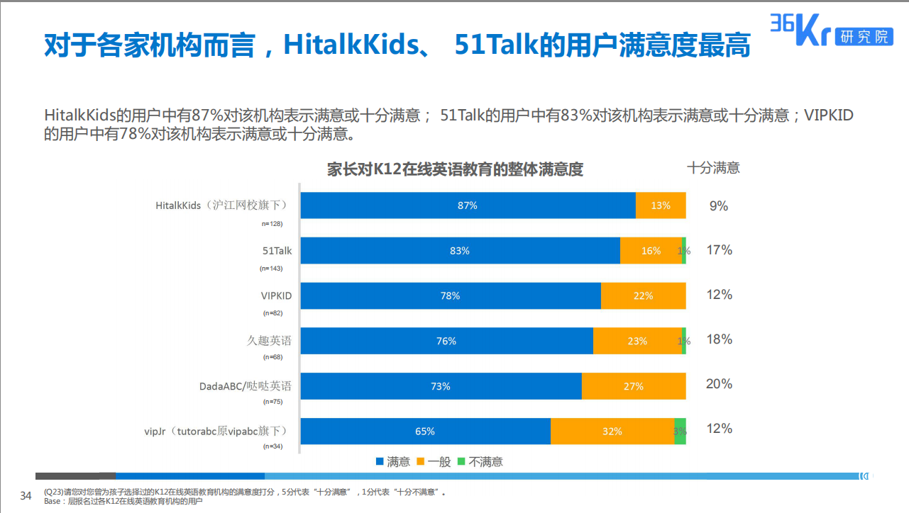 調(diào)研結(jié)果顯示,整體看來,51Talk是最受歡迎的K12在線英語教育機(jī)構(gòu),位列數(shù)據(jù)榜單首位,有35%的家長曾為孩子報名或?qū)頃楹⒆訄竺?1Talk;與此同時,51Talk也是用戶滿意度最高的K12在線英語教育機(jī)構(gòu)之一,在整體問卷中有83%的51Talk用戶對51Talk表示滿意。
