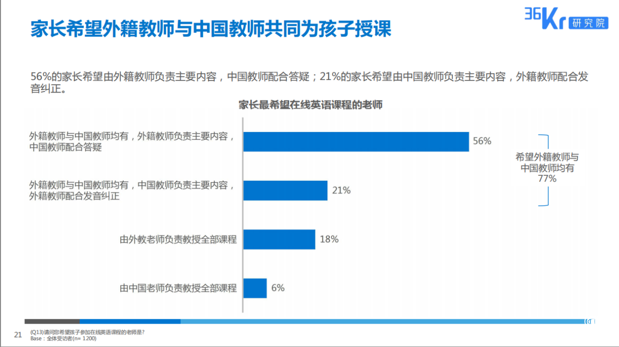 和51Talk在產(chǎn)品模式調(diào)研之初的結(jié)果一致,“外教+中教”的模式最受家長歡迎。56%的家長選擇了“外教與中教均有,外教負(fù)責(zé)主要內(nèi)容教學(xué),中教負(fù)責(zé)配合答疑”的教學(xué)形式,這是因?yàn)椋?1Talk擁有數(shù)百名中教老師全程提供學(xué)習(xí)跟蹤服務(wù),可以為每位學(xué)員制定個性化學(xué)習(xí)方案,安排課表并督促學(xué)員堅持學(xué)習(xí),繼而達(dá)到理想的學(xué)習(xí)效果。