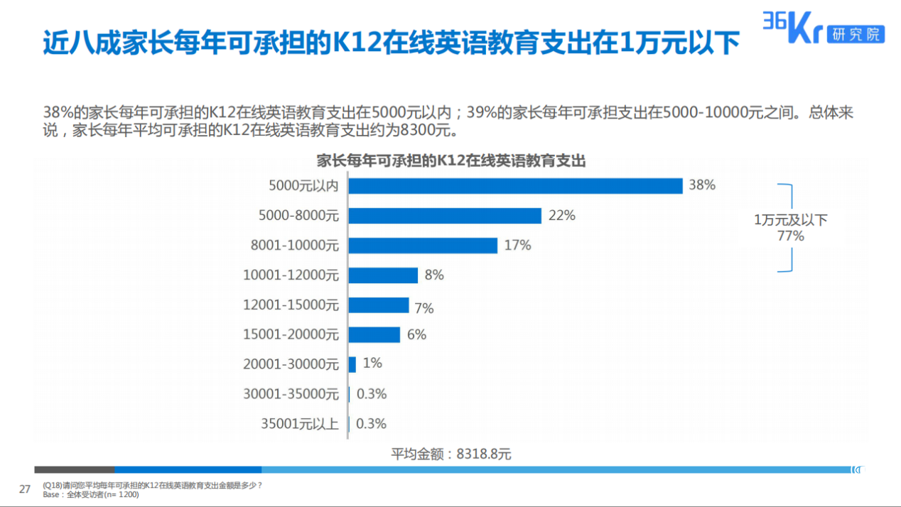 (家長每年可承擔(dān)的K12在線英語教育支出平均為8318.8元,近八成家長每年可承擔(dān)的K12在線英語教育支出在1萬元以下。)