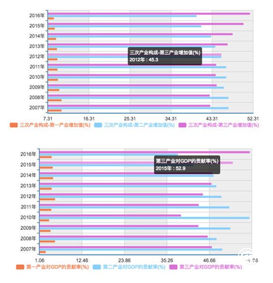 時至今日,中國已經(jīng)由以傳統(tǒng)工業(yè)、制造業(yè)與房地產(chǎn)為主的舊經(jīng)濟,逐漸向服務(wù)業(yè)、科技創(chuàng)新與信息技術(shù)領(lǐng)導(dǎo)的新經(jīng)濟體傾斜,近年來第三產(chǎn)業(yè)的動能不斷加強,2013年起第三產(chǎn)業(yè)增加值占GDP值的比重超過第二產(chǎn)業(yè),2015年起第三產(chǎn)業(yè)對GDP貢獻率首超50%,撐起經(jīng)濟的半壁江山。