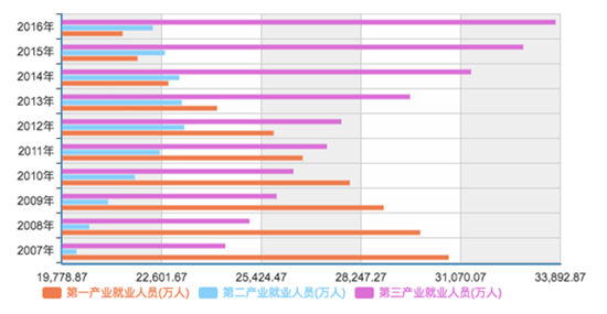 同時,新動能不但保障了經(jīng)濟繁榮,所創(chuàng)造的新增就業(yè)崗位也大超此前,2016年第三產(chǎn)業(yè)就業(yè)人數(shù)3.38億,占比43.5%。就業(yè)帶動居民收入近年來顯著提高,隨之而來促進消費成主動能。