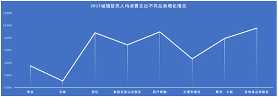 另一方面,高層次消費需求的涌現(xiàn)也是我們不可忽視的。從下圖《2017年城鎮(zhèn)居民在不同品類的支出增長情況》,我們可以看到醫(yī)療保健、教育、文化娛樂和其他商品服務(wù)的消費增速已經(jīng)同居住消費增速相當(dāng)。說明居民對高品質(zhì)生活、精神領(lǐng)域追求越來越重視。