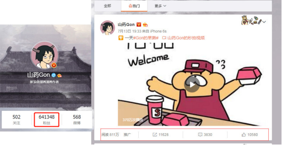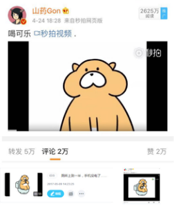 2017年4月24日,旱獺形象的作者山藥gon在微博發(fā)布了《Gon的旱獺》第一條短視頻《喝可樂》,在24小時內(nèi)獲得5萬+轉(zhuǎn)發(fā),2萬+評論,該條微博閱讀量超過2600萬,視頻播放量超過1300萬。