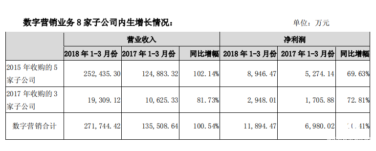 科達(dá)股份數(shù)字營銷業(yè)務(wù)快速增長,穩(wěn)步推進(jìn)營銷云布局。在剛剛發(fā)布的2018年一季報報告期內(nèi),公司數(shù)字營銷板塊實現(xiàn)營業(yè)收入 27 億元,比上年同期增加 117.42%, 營收占比升至 93%,實現(xiàn)凈利潤 1.19 億元,比上年同期增加 126%。其中,2015 年首輪收購的 5 家公司于 2017 年底業(yè)績對賭到期后業(yè)績?nèi)匀涣裂?,一季度實現(xiàn)營收 25 億元,同比增長 102.14%,凈利潤達(dá) 8946 萬元,同比增長 70%。2017年并購的三家子公司,一季度實現(xiàn)利潤2948萬元,同比增長73%。