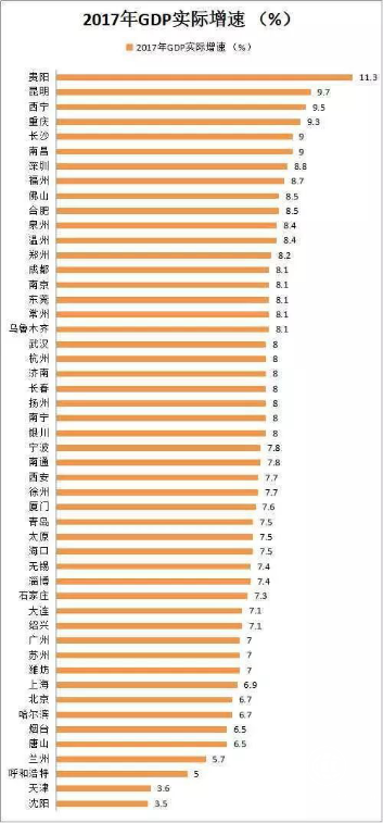 貴陽,一座近年來正在實(shí)現(xiàn)后發(fā)趕超的明星城市,2017年實(shí)現(xiàn)GDP同比增長11.3%,除保持兩位數(shù)高速增長外,更是連續(xù)四年排名全國省會(huì)城市增速第一。你知道在5年前它的增速排名多少嗎?65!