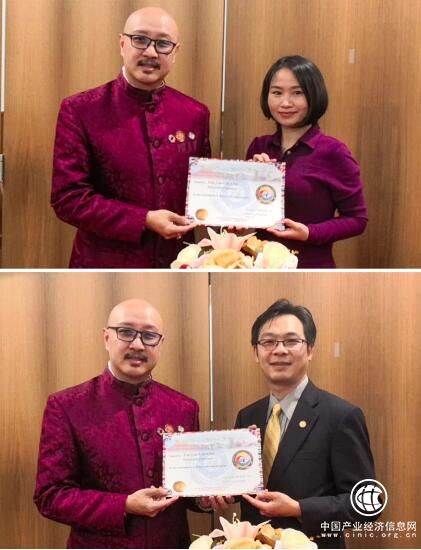 圖1:世貿(mào)總會創(chuàng)辦人拿督斯里白瑪奧色主席為聯(lián)合國世界人民理事會菁英發(fā)展部主任張艾米蘇頒發(fā)世貿(mào)總會聘書