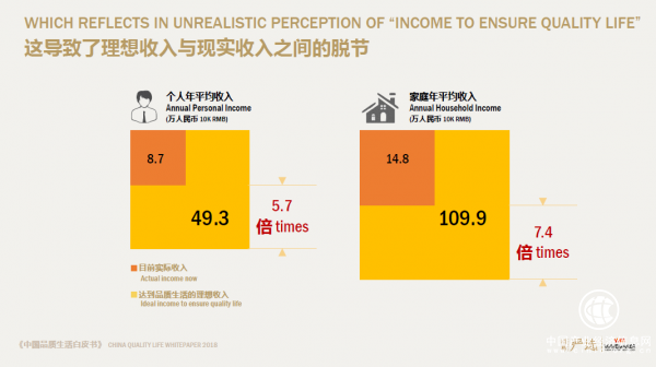 而有近一半的人認為,國外發(fā)達國家的生活品質(zhì)更好,消費者期待宏觀層面更完善的福利保障和資源。此外,達到品質(zhì)生活的理想收入方面,一般認為家庭平均年收入超過100萬,然而目前的平均家庭年收入在15萬左右,人們對美好生活有強烈的渴望和焦慮。