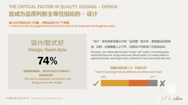 而“設計”越來越多地被認為和“品質(zhì)感”相關聯(lián),甚至是品質(zhì)的體現(xiàn)。74%的人會因為設計、款式好購買商品,這是因為欣賞美是人之天性,設計同時還體現(xiàn)了自我和品味。
