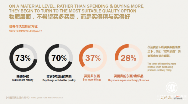 為逐步靠近向往的品質(zhì)生活,消費者希望精神與物質(zhì)共同提升。首先,人們積極尋求精神層面及生活方式上的改變。其次,物質(zhì)層面,在消費者不斷買買買的表象之下,他們“理性消費”的意識也在逐步崛起,即不希望買多買貴,而是買得精與買得好。
