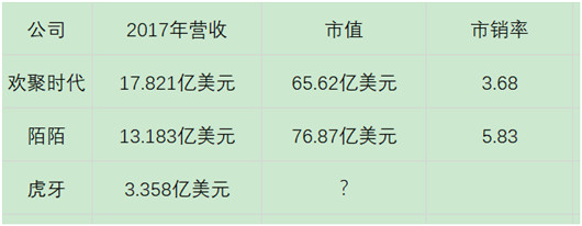 取最高值,以陌陌的市銷率5.83來(lái)計(jì)算,虎牙的估值只有19.6億美元。以營(yíng)收來(lái)看,30億美元?jiǎng)t高估。