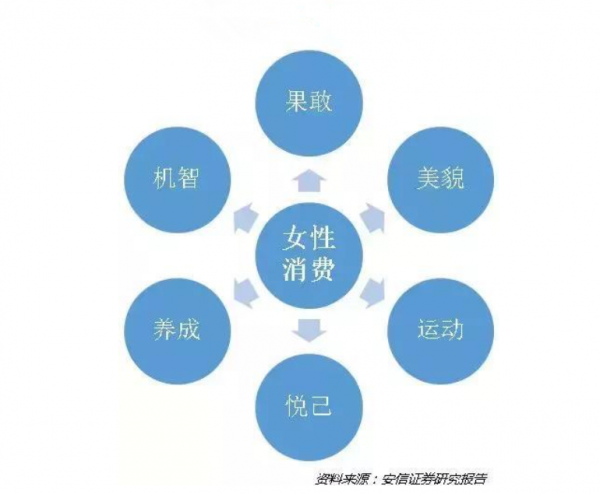 “她經(jīng)濟”的強勢崛起,令許多商家和平臺不得不改變或者重新調(diào)整戰(zhàn)略以迎合市場需求,洞悉并掌握“她經(jīng)濟”大潮下的女性消費偏好與趨勢,便成為了商家的首要要務(wù)。安信證券的一份研究報告中總結(jié)了“她經(jīng)濟”生態(tài)圈中女性消費的幾大關(guān)鍵詞(見圖),果敢、美貌、運動、悅己等詞語組合而成的消費偏好圈,也揭示了新時代女性對產(chǎn)品價值與生活品質(zhì)的重視程度。