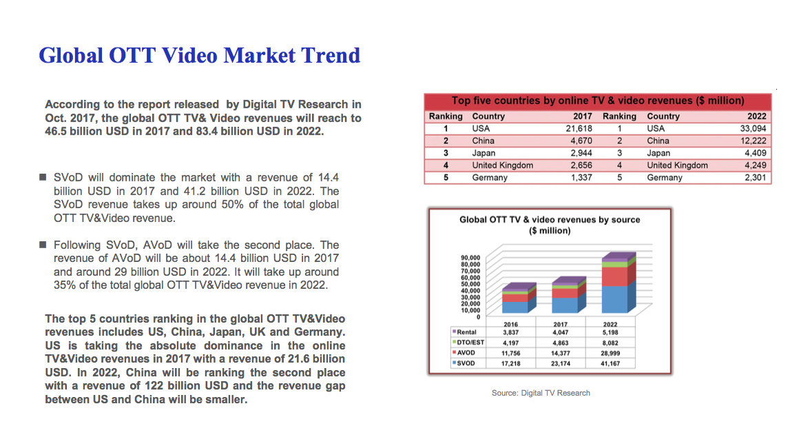 據(jù)Digital TV Research數(shù)據(jù)顯示:全球OTT TV & Video整個市場規(guī)模在2017年達到了465億美金,預(yù)計2022年可達到834億美金。其中SVoD占市場主導(dǎo)地位,2017年SVoD營收232億美金,預(yù)計到2022年將上升至412億美金,約占全球OTT TV & Video整個市場總額的50%;2017年AVoD營收為144億美金,預(yù)計到2022年將上升為290億美金,約占市場總額的35%。報告中提及:全球OTT TV & Video營收排名前5名國家包括美國、中國、日本、英國和德國。同時預(yù)計到2022年中國OTT TV & Video營收可達到122億美金,與美國的差距逐步縮小,約為美國的1/3。