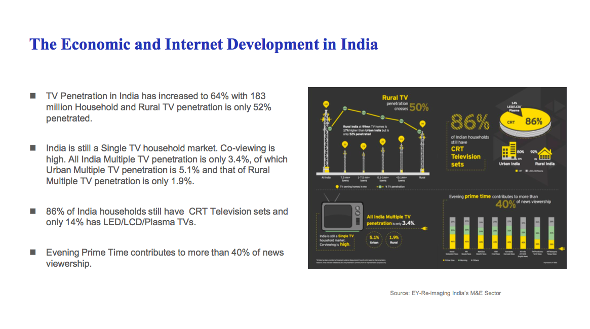 目前印度農(nóng)村電視滲透率超過50%,其中86%的印度家庭使仍然在使用CRT電視,同時印度家庭主要多數(shù)使用單一電視,多電視家庭僅占比3.4%;伴隨著印度市場的消費升級,CRT電視的更新?lián)Q代,OTT行業(yè)在印度將迎來大好的市場前景;以互聯(lián)網(wǎng)技術(shù)為主導(dǎo)的OTT企業(yè)更容易在印度打開市場服務(wù)用戶,因為從技術(shù)的角度來講,OTT內(nèi)容平臺比傳統(tǒng)電視臺更容易通過大數(shù)據(jù)、人工智能等技術(shù)為用戶實現(xiàn)高效精準(zhǔn)的內(nèi)容推送服務(wù)。OTT內(nèi)容提供商也由此更加了解用戶;從用戶的角度分析,印度OTT內(nèi)容的主要用戶群集中為年輕人,他們更快速接受互聯(lián)網(wǎng)為他們提供的影像內(nèi)容。在市場快速發(fā)展的同時,需要進一步尋求更多不同類型的OTT設(shè)備來作為服務(wù)的硬件載體,從而也給OTT設(shè)備商或運營商提供了非常巨大的發(fā)展空間。