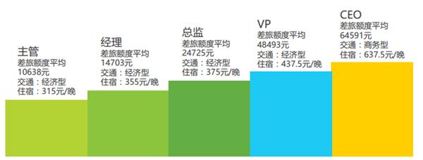 中小企業(yè)商旅范圍遍及國內外,差旅人員平均每月出差1.3次。出差頻次集中在每月2——3次,占比29.9%,而每周出差1次以上的占比也是非常大的,占比24.5%。出差費用隋著職級的上升也在上升,主管級別每月平均在10638元,住宿平均在315元/晚。CEO出差每月平均在64591元,住宿平均在637.5元/晚。