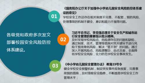 2017年4月李克強在國務(wù)院常務(wù)會議,“部署加強中小學(xué)幼兒園安全風(fēng)險防控體系建設(shè) 打造平安校園”中強調(diào):切實把校園建設(shè)成最陽光、最安全的地方。近幾年由于各級黨和政府多次發(fā)文部署校園安全風(fēng)險防控的重視。產(chǎn)生了很多教育部門或保險公司發(fā)起采購,由第三方安全風(fēng)險管理服務(wù)機構(gòu)來負(fù)責(zé)實施的校園安全隱患排查等業(yè)務(wù)。校園安全有專業(yè)的技術(shù)服務(wù)力量介入的方式在市場上被普遍認(rèn)同。