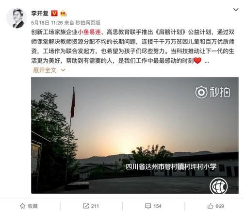 近日專注于云視頻會議的小魚易連攜手高思教育、鴻基金、創(chuàng)新工場和鴻合科技共同發(fā)起了“肩膀計劃”,致力于解決中國教育資源不均衡的頑疾。用雙師課堂的高科技手段為邊遠窮困地區(qū)的留守兒童提供與大城市孩子一樣的教育。各路大V紛紛轉發(fā)點贊,截止目前,肩膀計劃“藍天下,同課堂”視頻已經(jīng)有超過1000萬人觀看,僅“機智的何先生”一條微博就獲得了近萬人點贊,5300人評論。