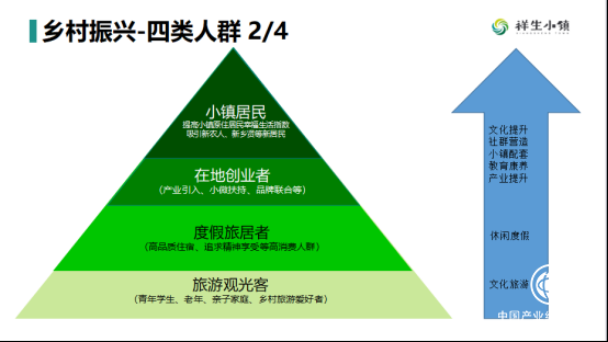 特色小鎮(zhèn)的主要客群包括四個層級:第一層級是底層的旅游觀光客,第二層級是過夜的度假旅居客,他們是高品質(zhì)住宿、追求精神享受的高等人群,第三層級是在地創(chuàng)業(yè)者,包括大學生返鄉(xiāng)創(chuàng)業(yè)的,再往上的第四層級就是小鎮(zhèn)的居住者,包括原住民和新住民。只有充分理解這四層客群的需求,才能更好地發(fā)展特色小鎮(zhèn)和鄉(xiāng)村振興。