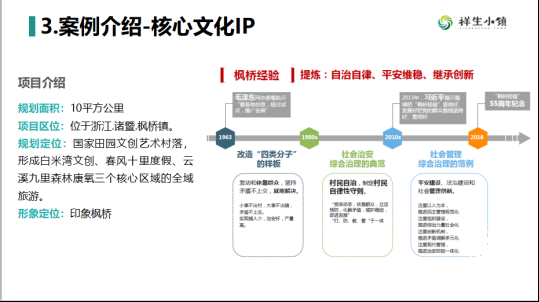 祥生·諸暨楓橋田園文創(chuàng)小鎮(zhèn)則是以文化傳承和文化創(chuàng)新為核心的小鎮(zhèn),從文化挖掘上實現(xiàn)鄉(xiāng)村振興。祥生小鎮(zhèn)基于“楓橋經(jīng)驗”自有的“自治自律、半耕半讀、自然共生、鄉(xiāng)村振興”的文化,導入度假、康養(yǎng)、文化創(chuàng)意等產(chǎn)業(yè),形成小鎮(zhèn)支撐下文化創(chuàng)新業(yè)態(tài)。