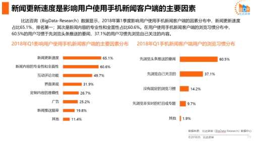 據(jù)比達(dá)咨詢數(shù)據(jù)顯示,2018年第1季度影響用戶使用手機(jī)新聞客戶端的因素分布中,新聞更新速度及新聞內(nèi)容的專(zhuān)業(yè)性和全面性分別以65.1%、60.6%的比例,成為最主要的兩大因素。伴隨移動(dòng)互聯(lián)網(wǎng)時(shí)代的信息大爆炸,用戶對(duì)高價(jià)值內(nèi)容資訊需求不斷增長(zhǎng)。手機(jī)新聞客戶端價(jià)值核心聚焦于內(nèi)容品質(zhì)上,擁有更具時(shí)效性和專(zhuān)業(yè)性的資訊,將給用戶帶來(lái)更好的體驗(yàn)。