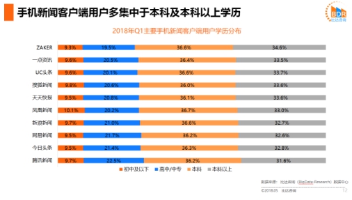 比達(dá)咨詢數(shù)據(jù)還顯示,手機(jī)新聞客戶端用戶多集中于本科及本科以上學(xué)歷,而ZAKER用戶中的本科及本科以上學(xué)歷高達(dá)71.2%,其中本科以上學(xué)歷占比34.6%,成為學(xué)歷最高的手機(jī)新聞客戶端。
