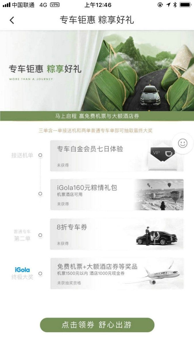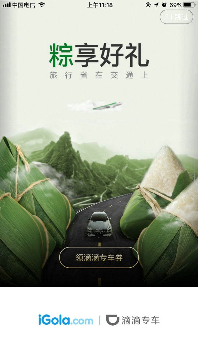 【圖:iGola X 滴滴,“專車鉅惠粽享好禮” 活動(dòng)界面】