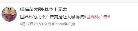 新浪微博上,關(guān)于世界杯廣告已經(jīng)自成話題。話題下,一眾球迷或戲謔、或調(diào)侃、或憤憤不平?!?/p>