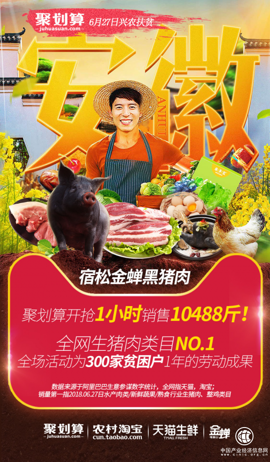 6月27日,對(duì)于安徽省國家級(jí)貧困縣的農(nóng)民們是個(gè)大日子,宿松縣的金蟬黑豬肉在阿里巴巴聚劃算生鮮平臺(tái),1小時(shí)賣了1萬多斤!全場活動(dòng)也銷售了金蟬黑雞8千多只。宿松縣拿到了一塊金字招牌——阿里巴巴農(nóng)村淘寶興農(nóng)扶貧官方服務(wù)站。