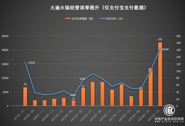 如圖所示,隨著氣溫升高,大渝火鍋(吳江吾悅店)當日交易筆數和當日GMV(交易流水金額)急劇下降,到4月12日,交易筆數和GMV同時降到最低點,就在當天,大渝火鍋借助縱橫客CRM工具,在口碑上線了兩種特別的代金券。此后,數據出現觸底反彈,整體走高,4月13日到4月21日這一周,環(huán)比上一周,交易筆數暴漲217%,GMV驟增77%。