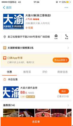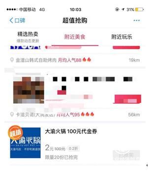 ▲大渝火鍋2元抵100元代金券被推薦到口碑首頁