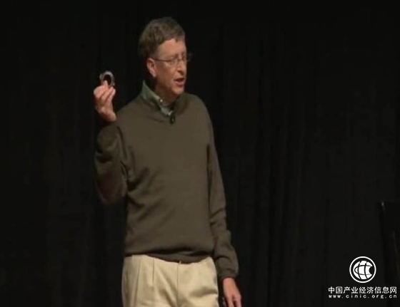 圖為:2012年比爾·蓋茨在美國斯坦福大學(xué)演講時重點介紹商環(huán)產(chǎn)品創(chuàng)新發(fā)明成果