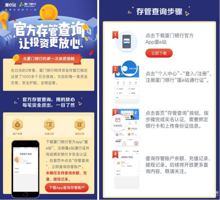 2018年7月,廈門銀行上線的存管查詢功能,給投資人吃下一顆“定心丸”。用戶可便捷查詢存管銀行的資金流水記錄,真正實現(xiàn)了銀行可以對用戶的資金進行管理和監(jiān)督。同時也有助于緩解投資人的緊張心理,信任網(wǎng)貸平臺信息中介的身份。