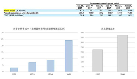 微信流量的的另一個優(yōu)勢是獲客成本極低、且熟人關系銷售轉化高。通過招股書計算,拼多多過去四個季度單個客戶獲取成本分別為3元、7元、9元和24元。2018Q1由于廣告投入大幅增加,單客成本翻了三倍。但對比京東,不及其1/10。