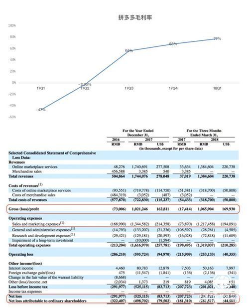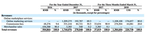 從招股書看,拼多多的收入分為線上平臺服務費和商品銷售收入,線上平臺服務費是包括線上推廣服務費和交易傭金,模式跟淘寶天貓如出一轍。商品銷售費主要是之前拼好貨留下的自營商品收入。