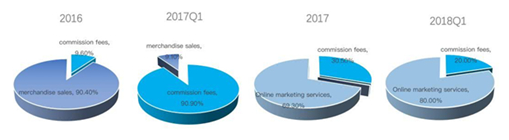 從招股書看,2016年(拼多多和拼好貨合并于9月),拼多多90%收入為商品銷售收入。而2017Q1,拼多多的主要收入為交易傭金,占比超過90%,商品銷售收入僅剩9%。真正讓收入起飛的是從2017年4月上線的線上推廣服務開始,不再依靠商品銷售收入,業(yè)務全面向服務轉型。