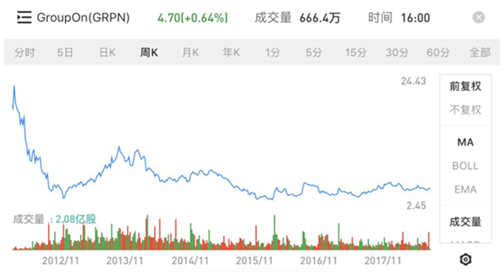 起初,拼多多主打的兩個點:1)實惠拼團,2)限時秒殺。拼團美國早有團購鼻祖Groupon,顯然,拼多多不想被稱為團購網站,Groupon的走勢如下慘烈,猶記得當年千團大戰(zhàn)的潮起潮落,從2010年團購網站迅速崛起,不到3年銷聲匿跡或改頭換面,如果美團還是個團購網站,不會有今天的美團。