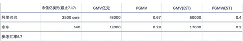 雖然,同樣是賺平臺推廣服務費用的拼多多跟淘寶天貓一致,但阿里4846億美元的市值中包含了阿里持有的螞蟻金服33%股權(約500億美元),包含了阿里云業(yè)務、阿里新零售、菜鳥物流以及阿里投資的項目等龐大的阿里系。如果將刨除非電商業(yè)務,阿里的核心電商業(yè)務粗略估算市值對應3500-4000億美元左右,阿里巴巴FY2018(注:阿里巴巴 FY2018對應 CY2017.4-2018.3)GMV4.8萬億元人民幣,按照6.7不變匯率,且阿里巴巴FY2019GMV增速不變即6萬億元,則對應 Forward P/GMV=0.4-0.45。