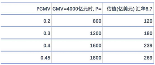 根據拼多多招股書,2017年實現GMV1412億元,2018Q1GMV662億元,假設2018年增長如預期,2全年GMV將達到4000億元,則對應的估值如下: